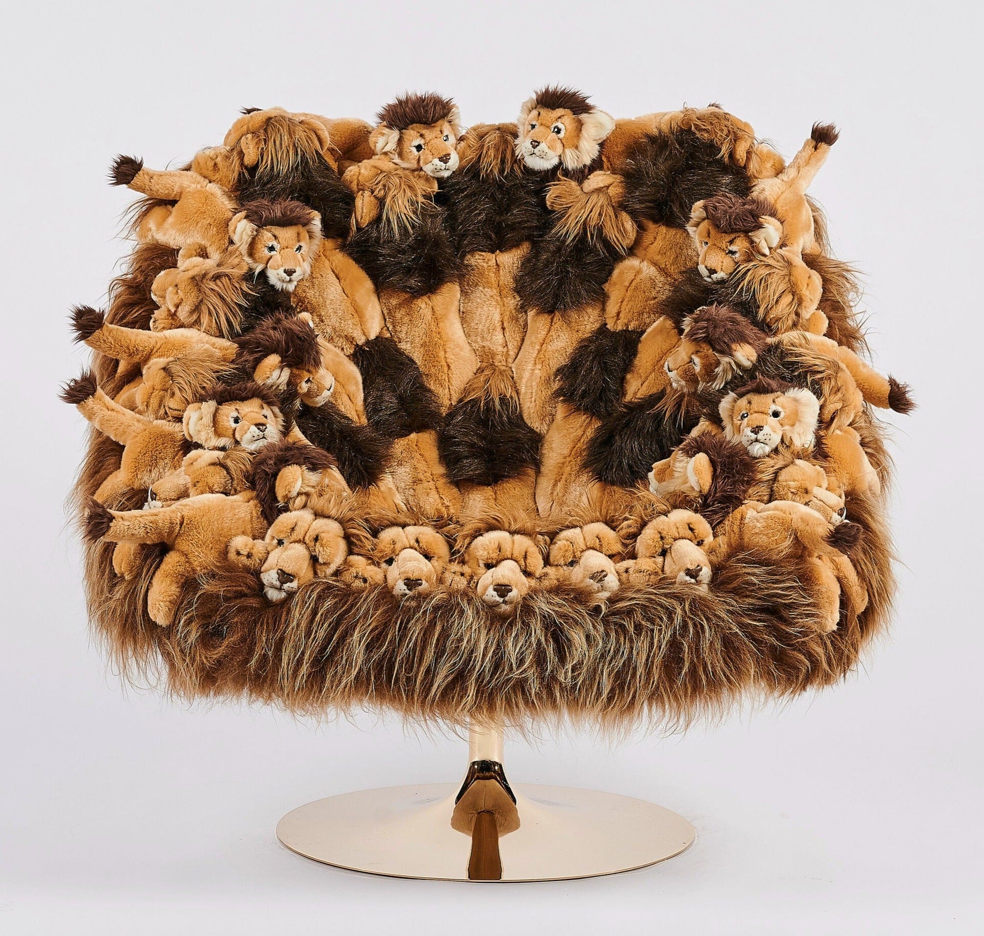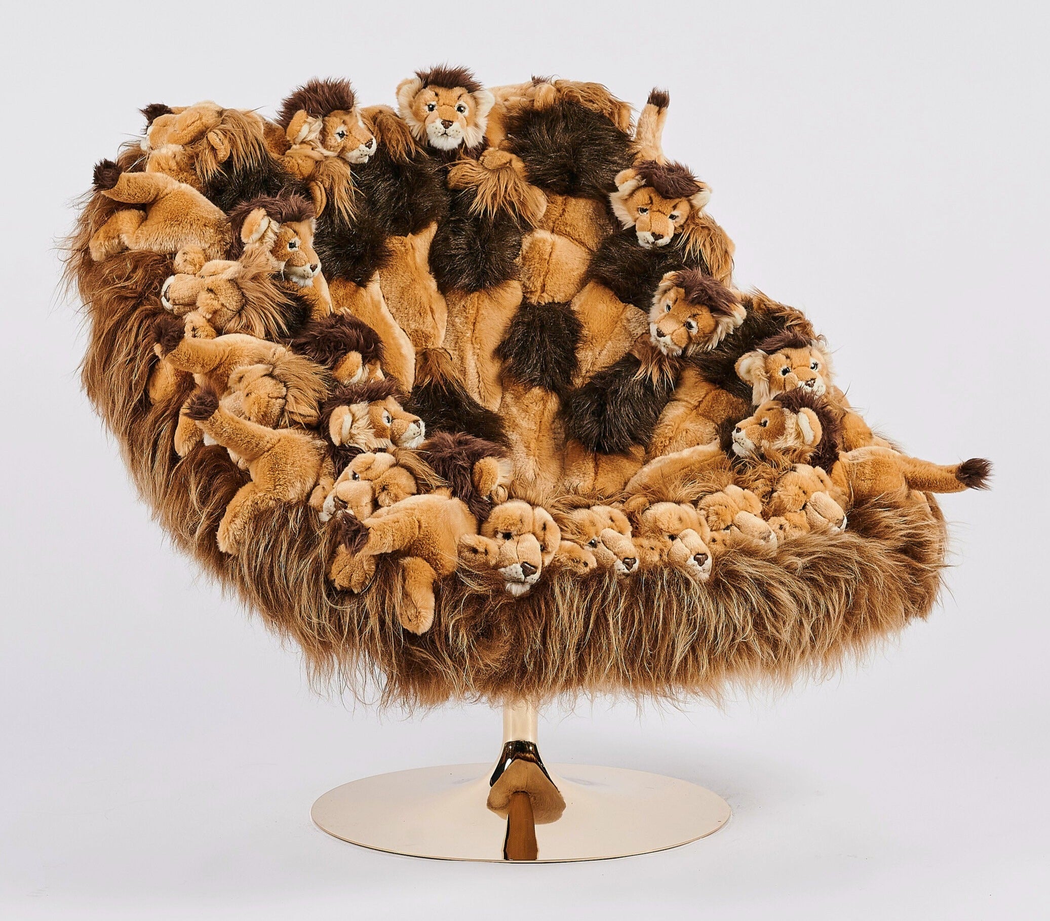 Materials: Handmade lounge chair adorned with various stuffed lions. Metal disk base available in various finishes. Handmade polyester plushes, metal, wood, textile fabrics, cowhide, and sheepskin, handmade in Belgium. Swivel.